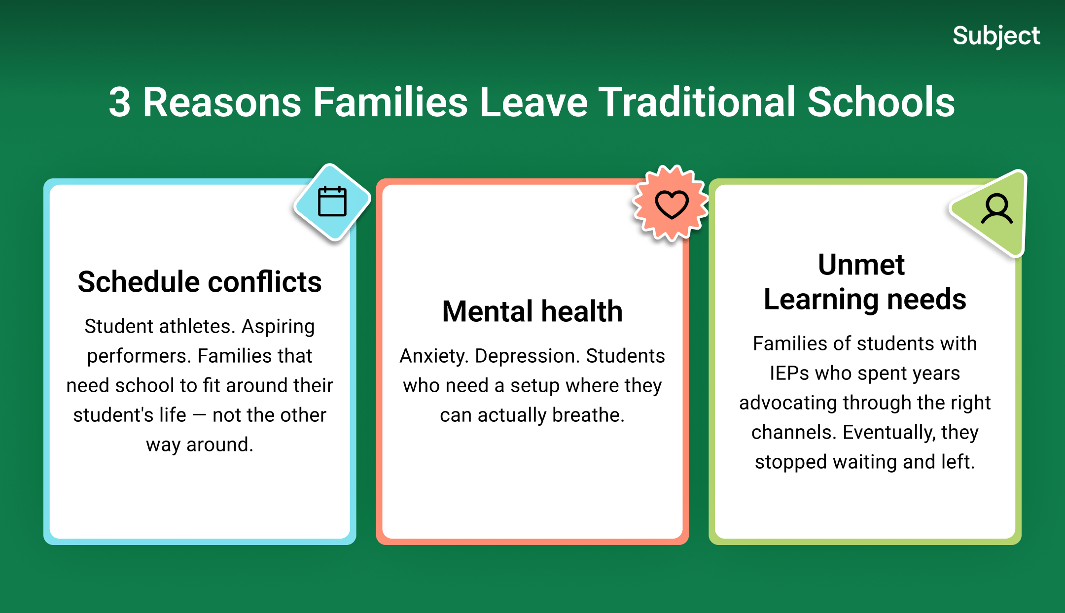 Unmet learning needs. Families of students with IEPs spent years advocating through the right channels. Eventually, they stopped waiting and left. These families want a program that treats their student like a person, not a file number.
